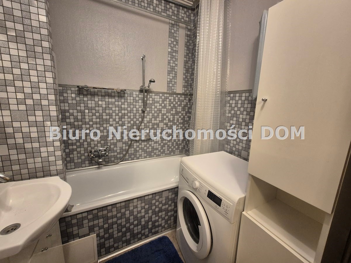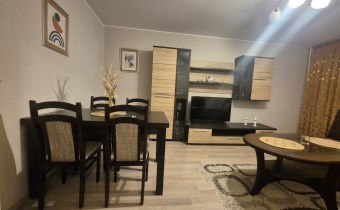 W mieszkaniu znajduje się pełne wyposażenie, w tym meble, pralka, lodówka i telewizor.