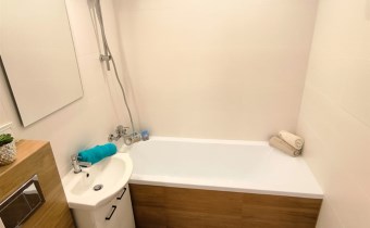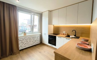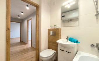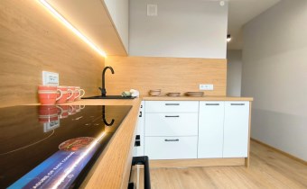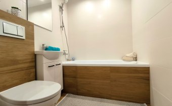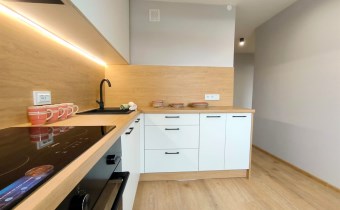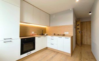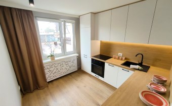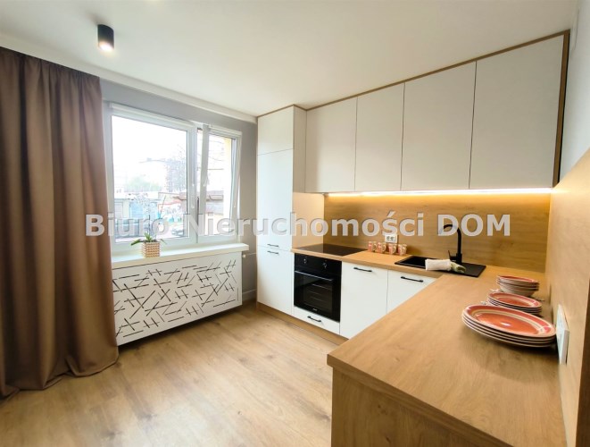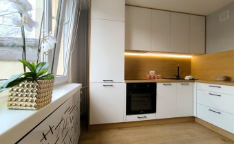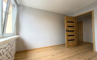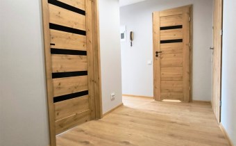 Wnętrze po generalnym remoncie – na podłogach nowe panele i płytki, nowoczesny wystrój oraz starannie dobrane wykończenia sprawiają, że mieszkanie nie wymaga żadnych nakładów finansowych.